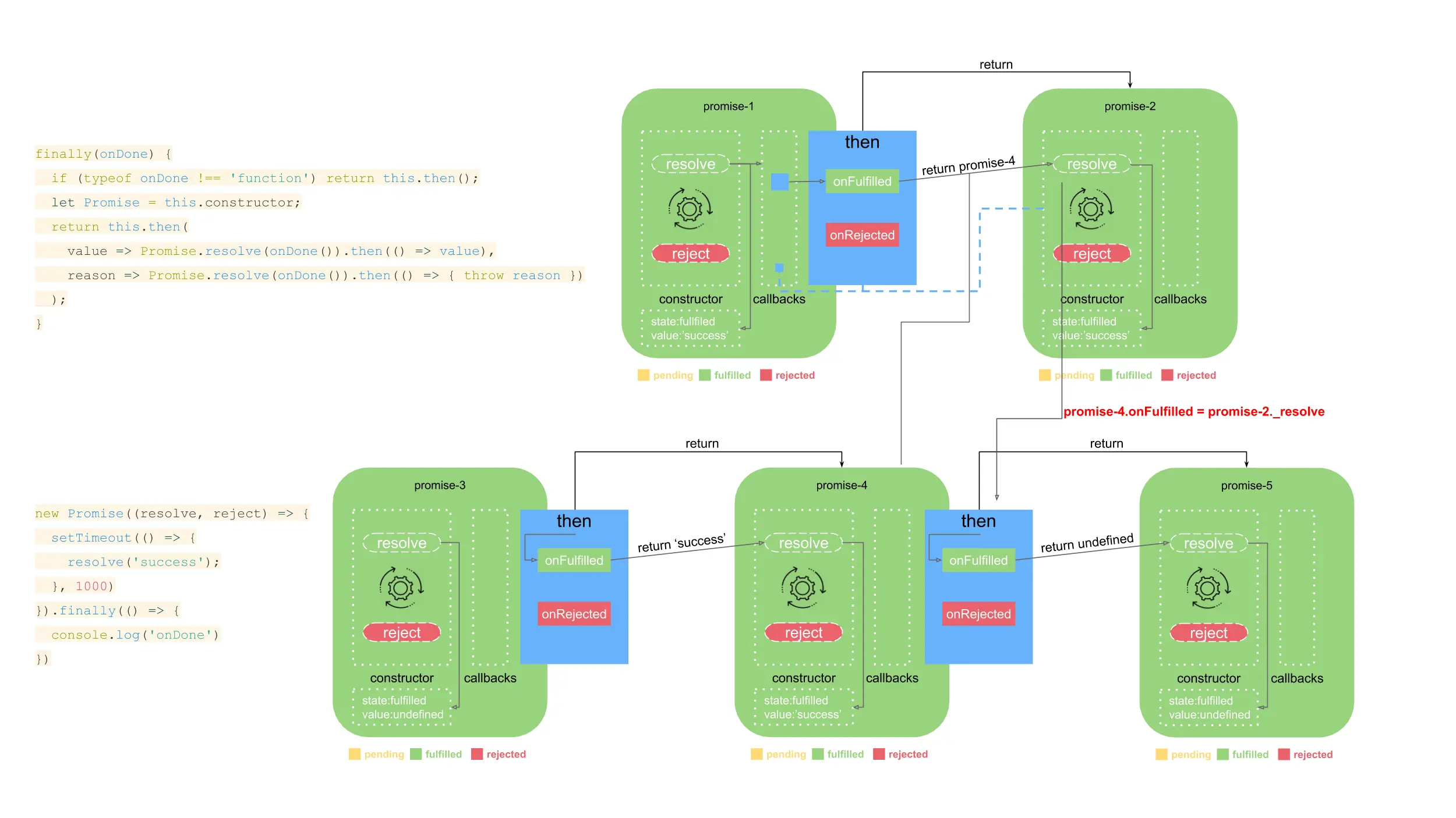 finally 的实现看起来简单,实际理解还是比较困难,对于上面的实例,中间其实有5个 Promise实例生成。如下图所示: