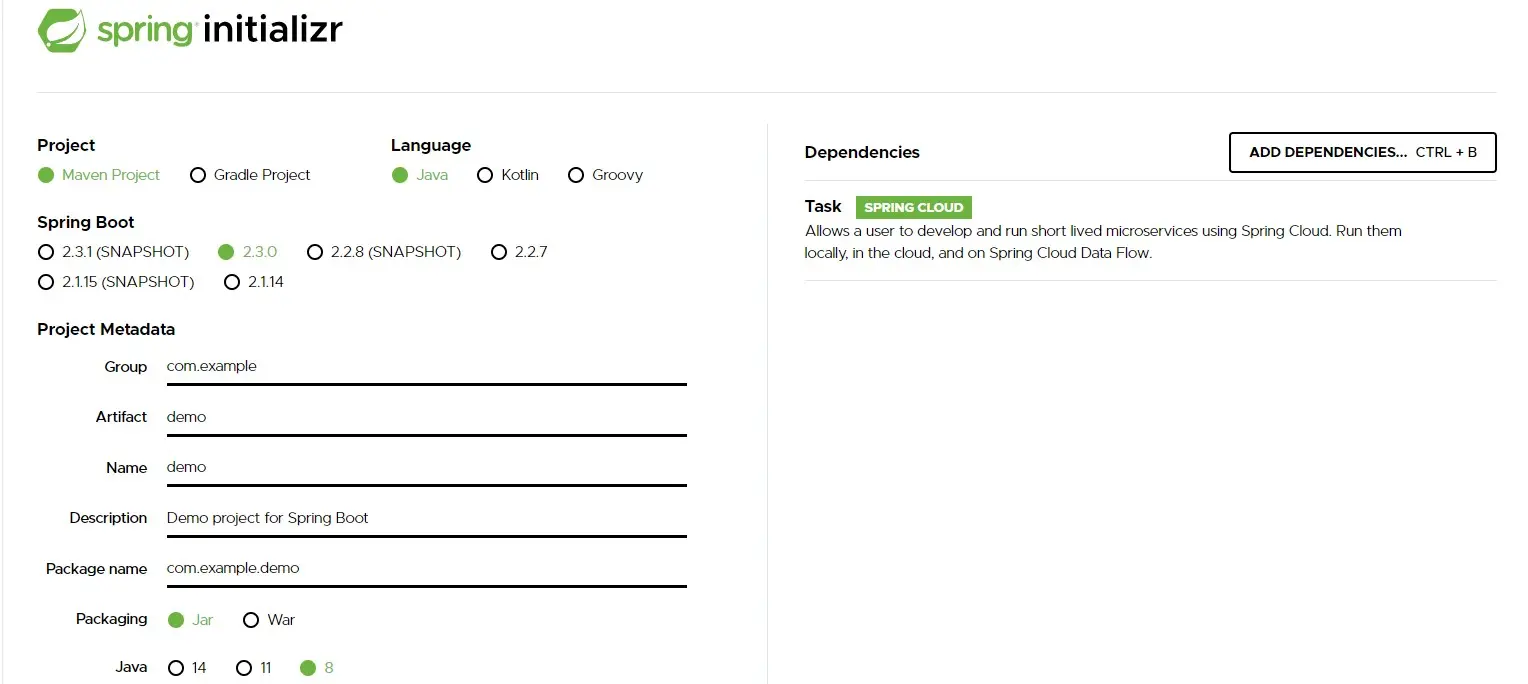 Spring Initalizr 快速创建项目,引入task依赖,示例如下: