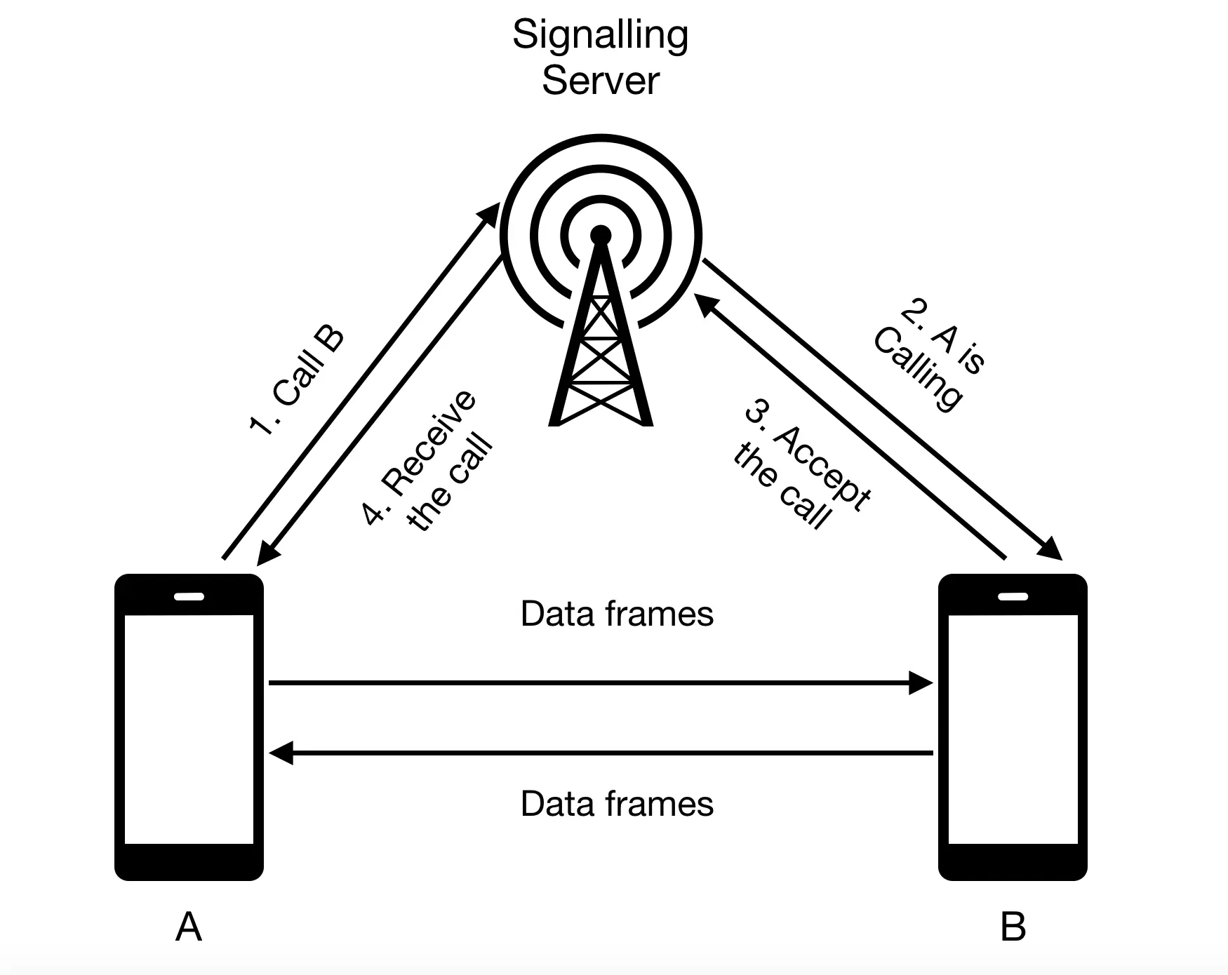 从上图可以看AB互相呼叫的相关流程需要通过信令服务器中转,而视频/音频等流量数据是点对点直接传输的。