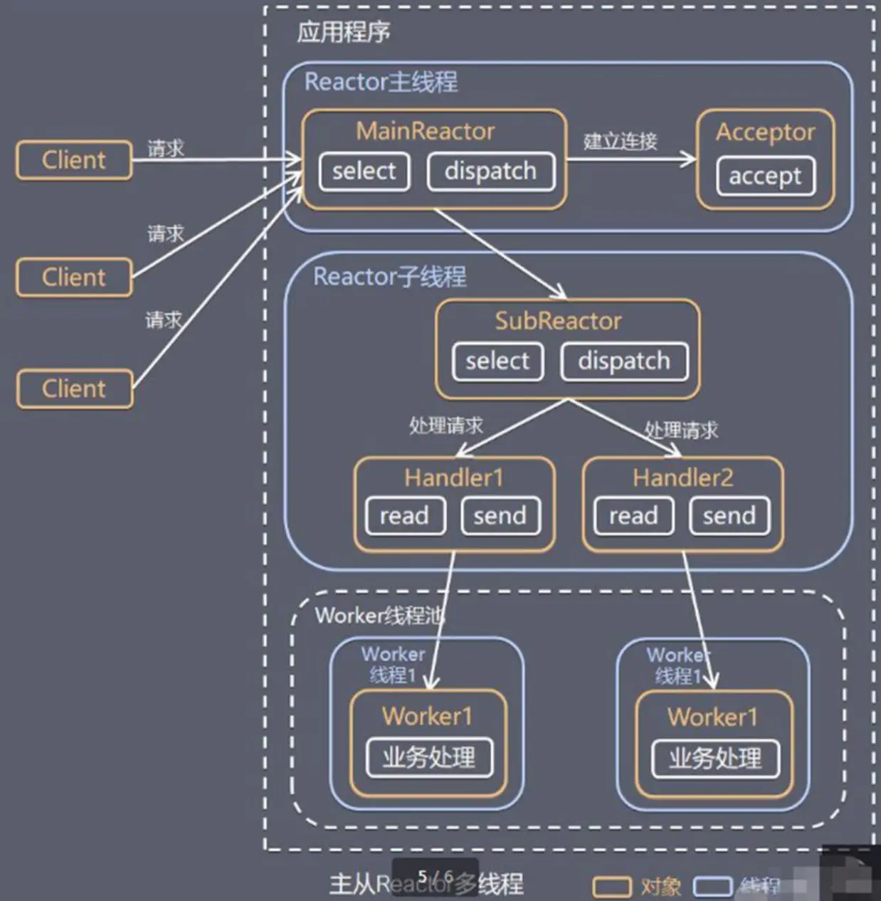 - 主从 Reactor 多线程:MainReactor负责监听服务端的连接请求,接收到客户端的连接后,将SocketChannel从MainReactor上移除,重新注册到SubReactor线程池的线程上。SubReactor处理I/O的读写操作,NIO线程池负责消息的读取、解码、编码和发送。