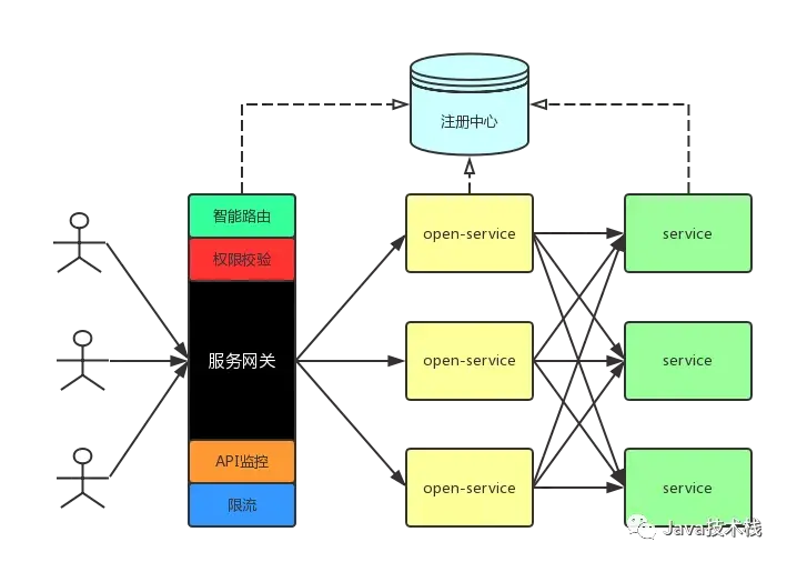 引入服务网关后的微服务架构如上,总体包含三部分:服务网关、open-service和service。关注微信公众号:Java技术栈,在后台回复:架构,可以获取我整理的 N 篇最新架构教程,都是干货。