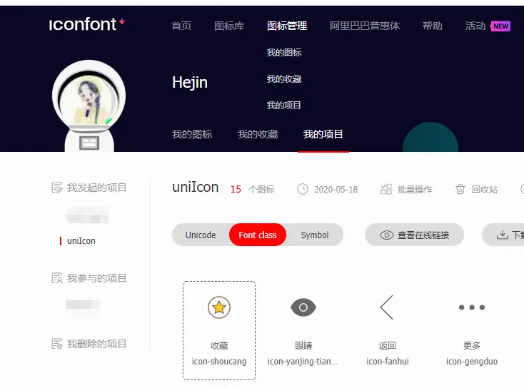 2、找到图标管理->新建项目,或者使用已有的项目,用于保存自己的图标;
