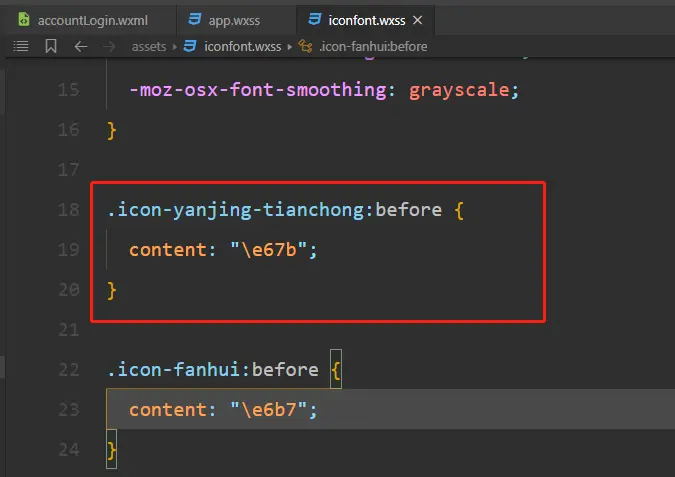 4、小程序中把iconfont.css的后缀名改为wxss,在项目中直接使用i标签即可
