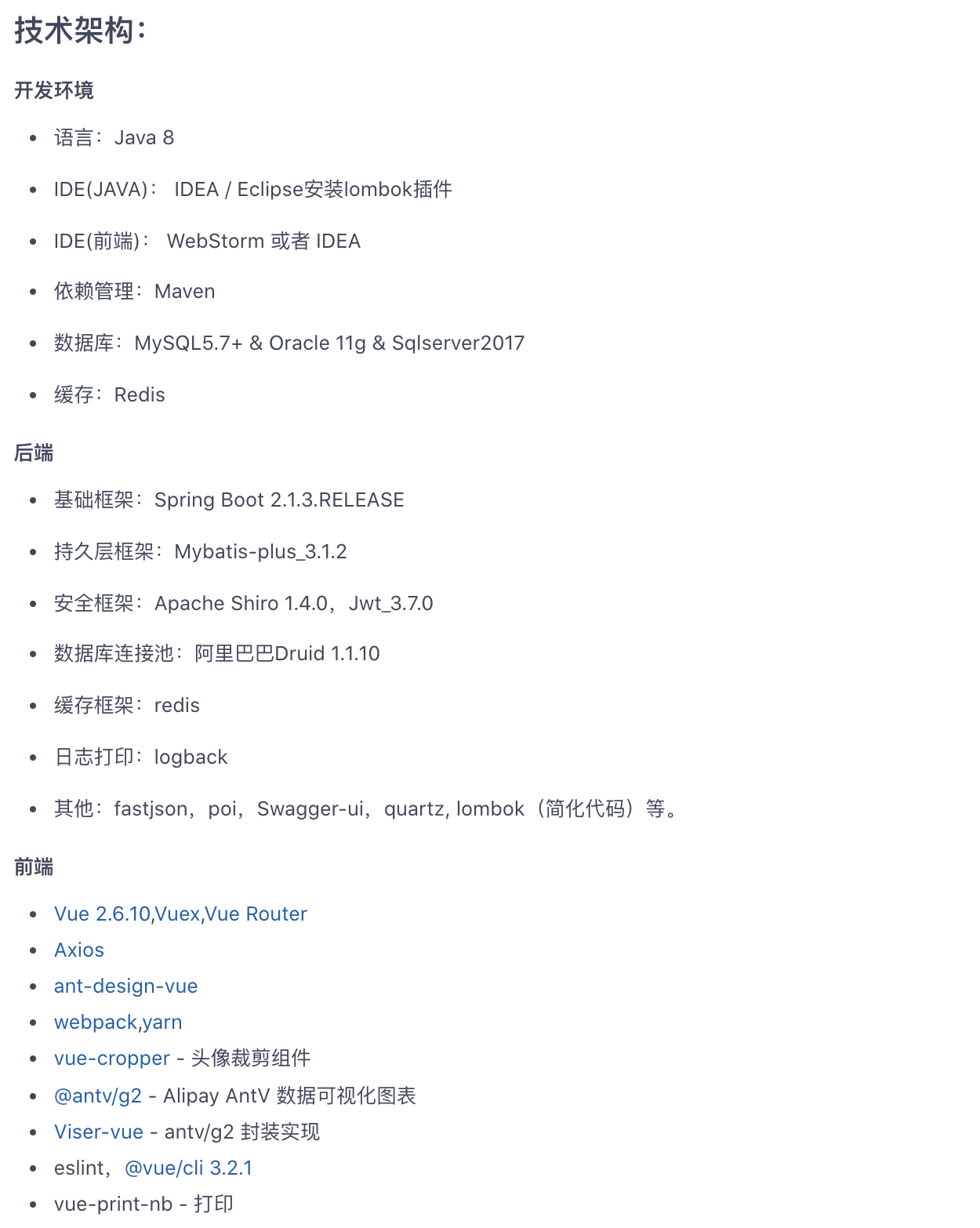 - 采用主流框架 :整体采用现在流行的前后端分离架构:后端框架为主流的 SpringBoot 2.x,前端为主流的 Ant Design&Vue。另外,还用到了 Mybatis-plus 数据库层面的框架,以及 Shiro 和 JWT 做身份认证和权限管理。