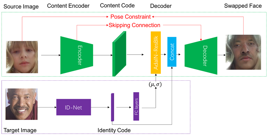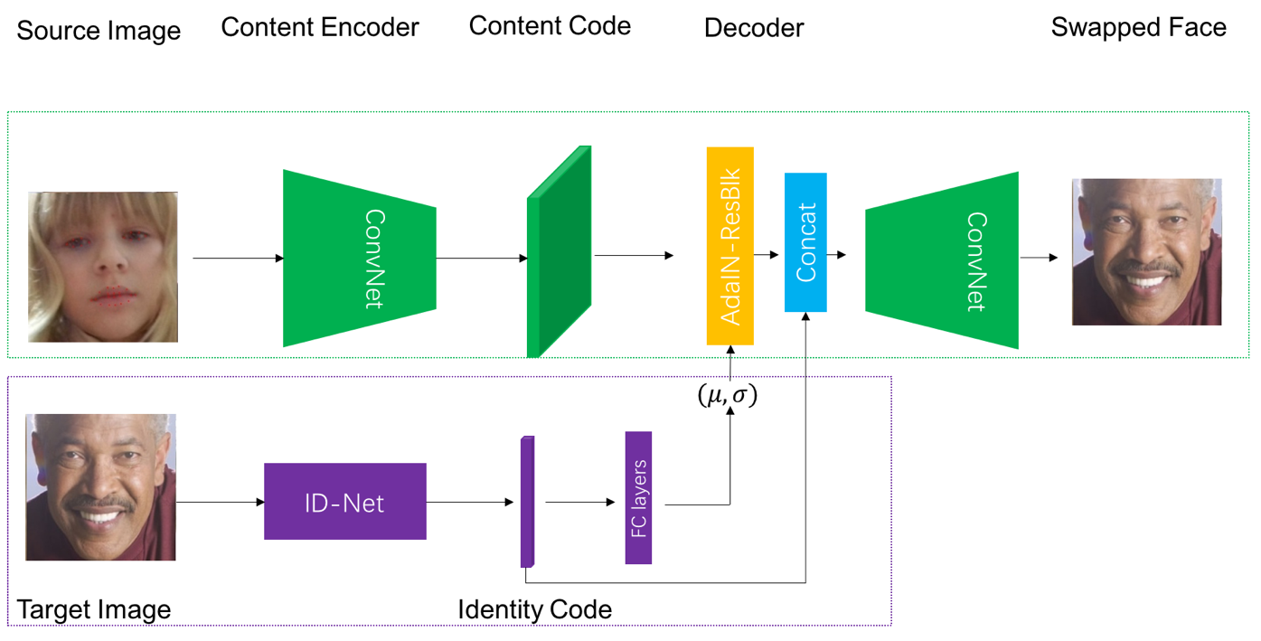 然而在实际操作中,我们注意到了以下两个问题:I)训练网络时的收敛速度很慢;II)容易产生人工造成的不自然缺陷(artifacts)。这两个问题让我们重新反思换脸问题的本质:目标人脸的ID固然可以按照style的思路注入源人脸的content中,但是这种方案很类似于传统的2D/3D视觉中的“贴脸”策略——完全采用目标人脸的ID信息而抛弃源人脸的;而要达成“换脸”,我们实际上只需要关注一个从目标人脸的ID到源人脸ID信息的变化。
