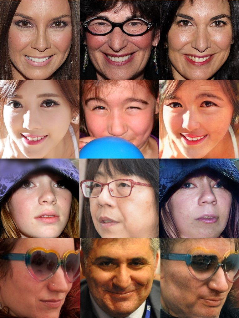 图7:效果展示,从左往右分别为:源人脸,目标人脸,生成人脸