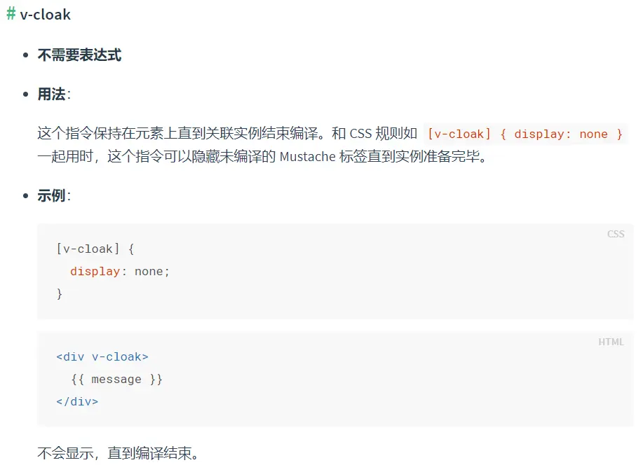 {{}}插值表达式在更新时有闪烁问题且会闪现出插值表达式也就是双花括号,浏览器卡顿时表现尤为明显,v-cloak指令的作用就是解决这一问题的。