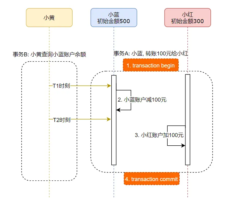 上面例子, AD两个根本目标是必须被保证的, 那么T1时刻和T2时刻, 小黄去查询小蓝的账户余额具体能查到什么值, 是受影响的;