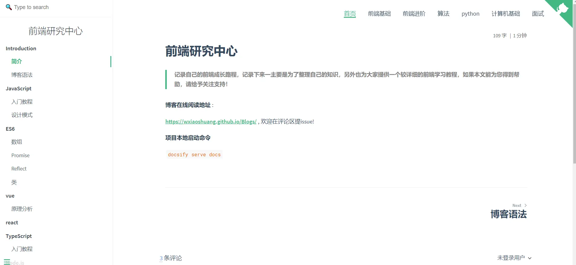 这篇文章只介绍了侧边栏配置和评论功能配置,docsify还有很多自定义配置和插件,比如代码复制,分页,tabs功能,想好好捯饬自己博客的可以去官网好好研究,我自己也捯饬了一天,才配置好了我的博客功能