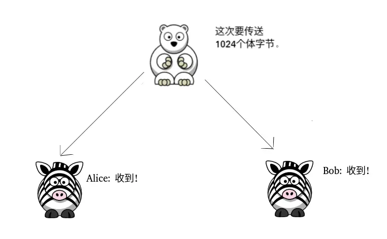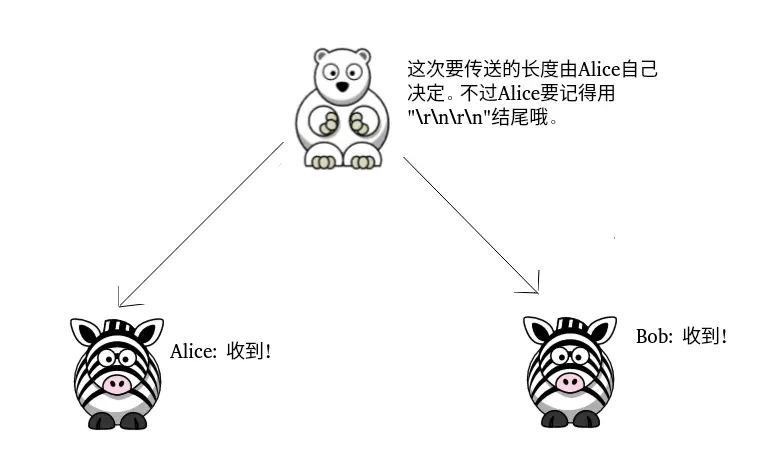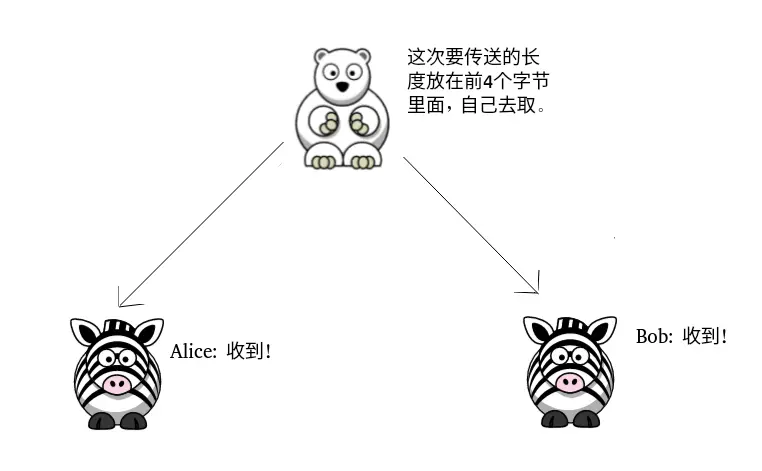 - 然后发送一个长的实际数据,用从头部中获得的长度来确定边界。