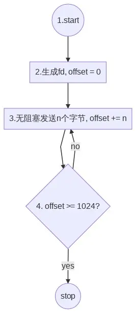static int alice_send_data(int fd, char *wr_data_buf) { int n; n = send(fd, wr_data_buf + offset, 1024 - off, MSG_DONTWAIT); /* 无阻塞发送了n个字节*/ if (n < 0) { if (errno == EAGAIN || errno == EINTR) return 0; else { return -1; /* error */ } } else if (n == 0) { return 1; /* socket close */ } offset += n; /*记住总共发了off个字节 */ if (off < 1024) /*如果小于预先给定的长度,返回0,继续调用本函数发送 */ return 0; return 1; /*发完了,返回1,继续下面的工作 */ } static int alice_send_epoll(int fd, char *wr_data_buf) /* edge 方式 */ { int offset = 0; int finish; do { finish = alice_send_data(fd, wr_data_buf) } while (!finish); } ``` -