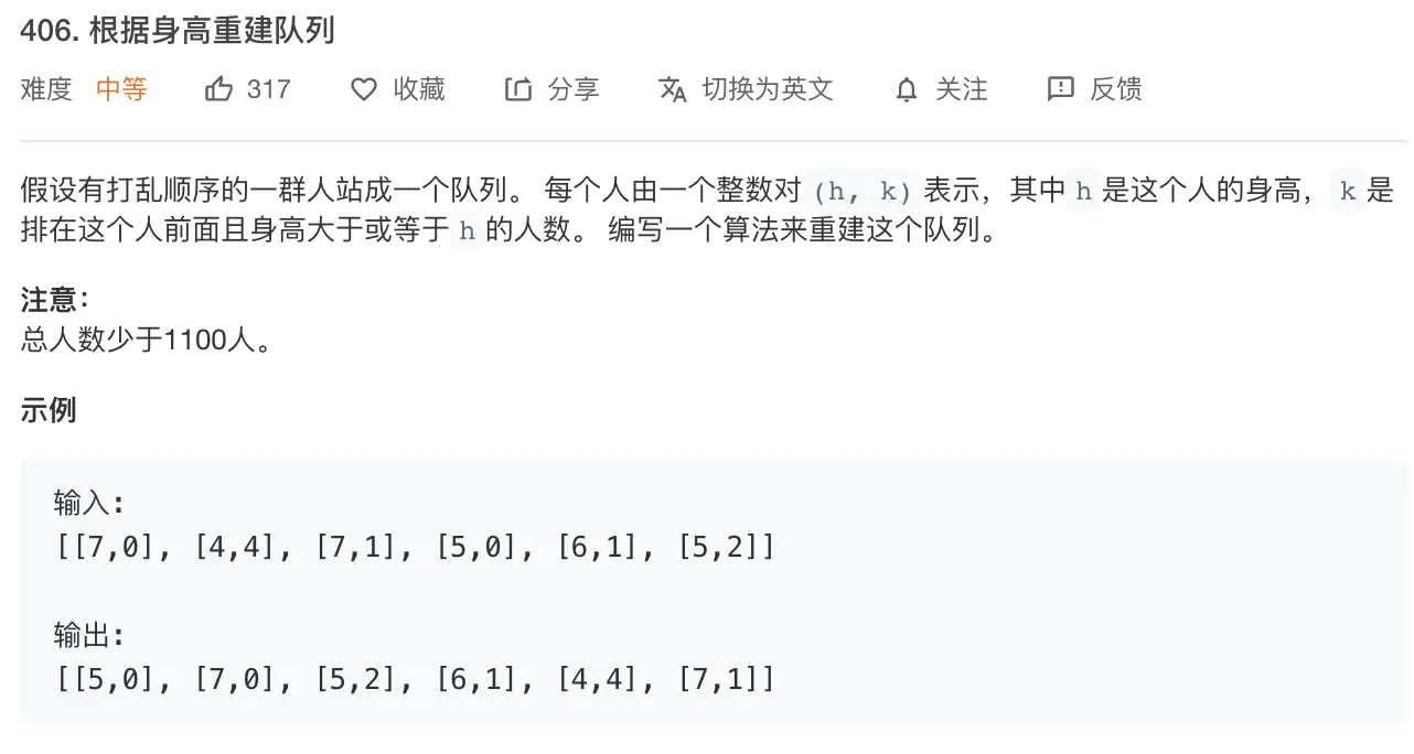 核心思想:高个子先站好位,矮个子插入到K位置上,前面肯定有K个高个子,矮个子再插到前面也满足K的要求。