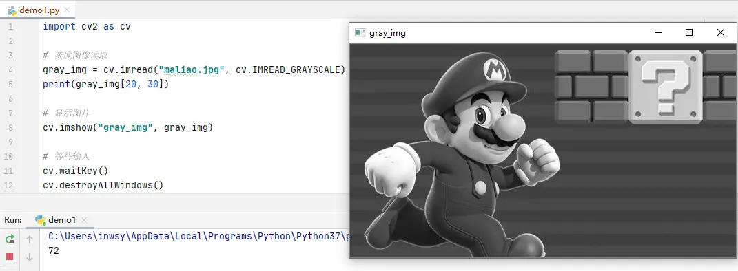 读取像素可以通过行坐标和列坐标来进行访问,灰度图像直接返回灰度值,彩色图像则返回B、G、R三个分量。
