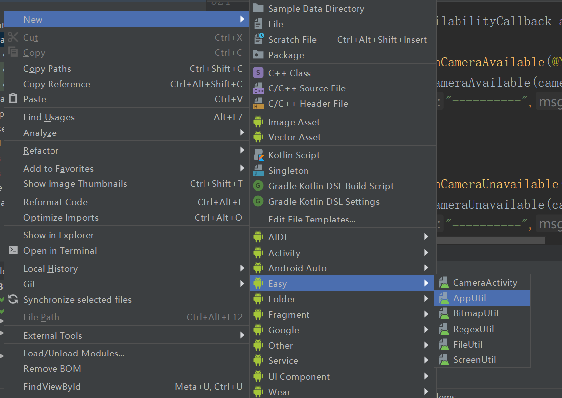 最后保存,重启android studio即可通过new --> Easy --> CameraActivity生成指定的代码