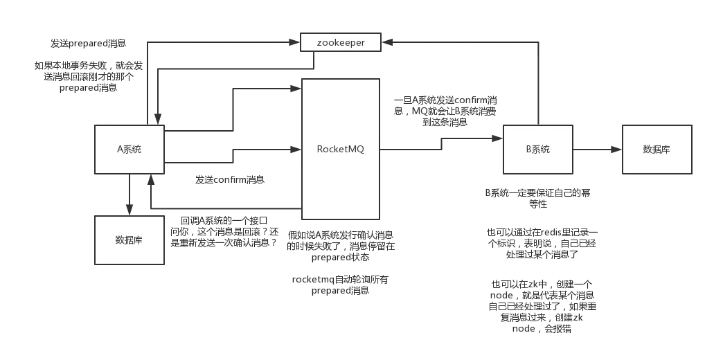 - MQ会自动定时轮询所有prepared消息回调你的接口,问你这个消息是不是本地事务处理失败了,所有没发送确认的消息,是继续重试还是回滚? 这里你就可以查下数据库看之前本地事务是否执行,如果回滚了,那么这里也回滚吧。这个就是避免可能本地事务执行成功了,别确认消息发送失败了。