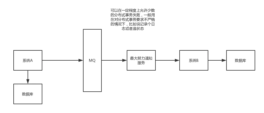 若系统B执行成功就ok;若系统B执行失败,那么最大努力通知服务就定时尝试重新调用系统B,反复N次,最后还是不行才放弃