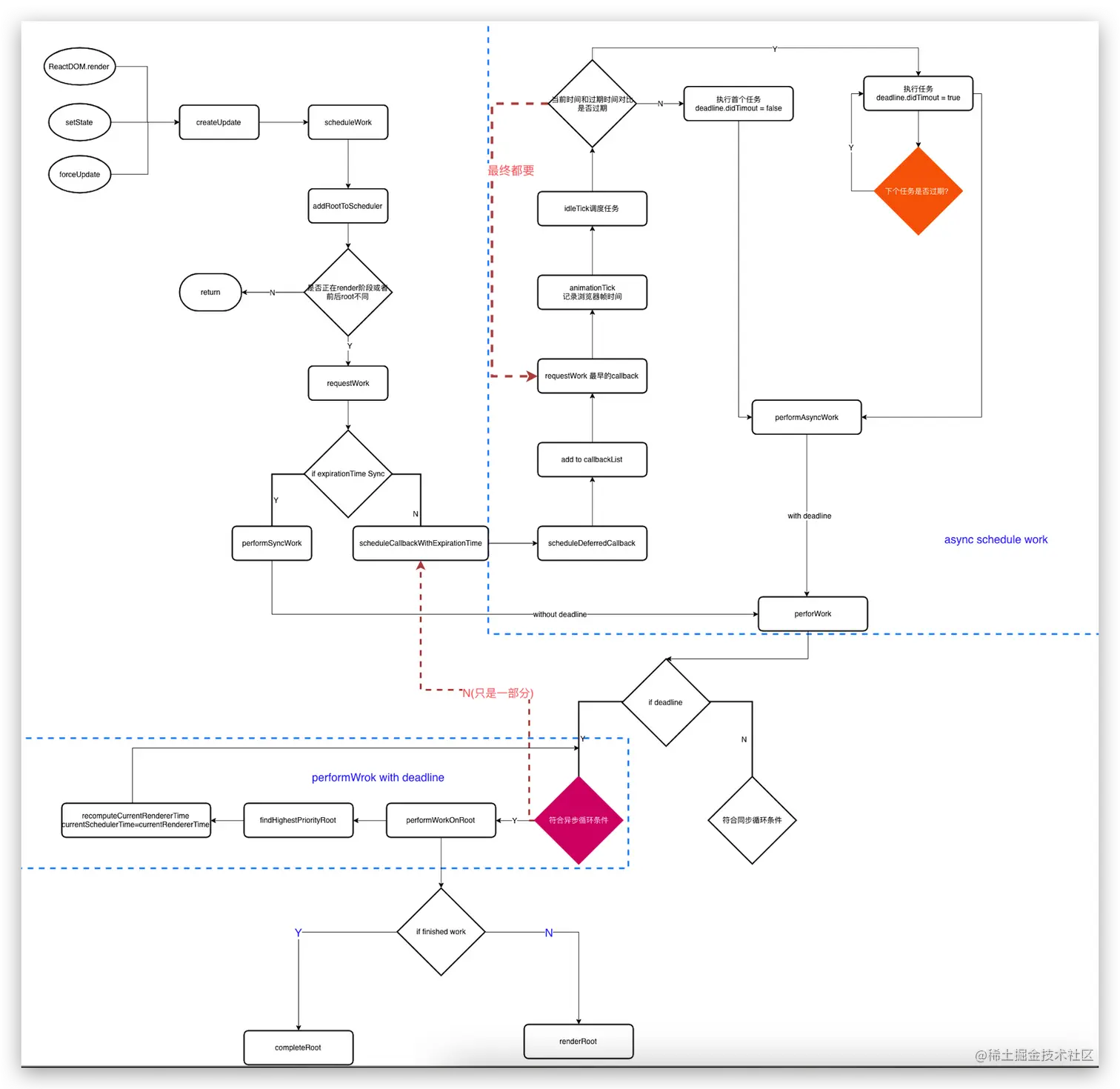 * 1 ReactDOM.render、setState、forceUpdate都会引起createUpdate,从而触发scheduleWork,然后scheduleWorkToRoot:创建root节点并计算expirationtime,返回root。然后通过判断是否正处在render阶段,或者root是不是前后不同来判断是否要继续执行还是return。如果是render阶段,或者root前后相同那就停止调度,直接return。