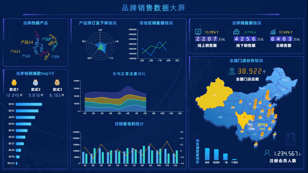 我们现在企业、公司大多都实现了全国各地多家门店或者分舱口,而数据可视化能够将各个区域的销售额及支出、利润环比体现直观清晰的展示在大屏上,方便观看者解读和比对它在两座标之间的位置和关系。灯果可视化的地图组件不论是世界地图还是中国地图,省份、城市都可以精确到经纬度去实现信息呈现的效果。