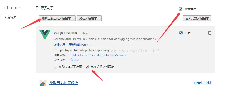 添加方法:在chrome浏览器输入地址:“chrome://extensions/”进入扩展程序页面,然后点击“加载已解压的扩展程序...”按钮;选择vue-devtools>shells目录下的Chrome文件夹;还需允许文件地址是否访问。如果看不到“加载已解压的扩展程序...”按钮,先勾选“开发者模式”。如