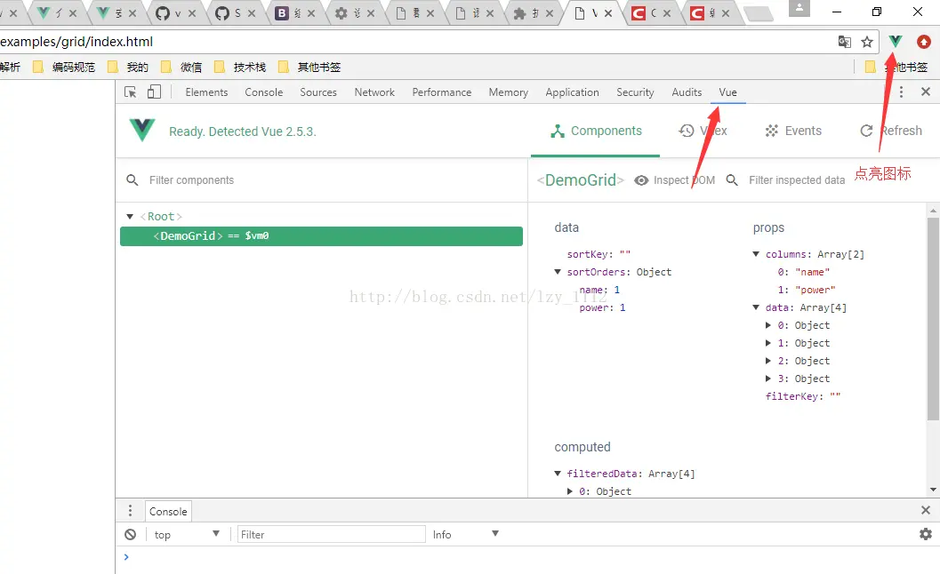 打开我们的vue应用,打开调试,点击vue扩展图标,就可以使用了。如下图: