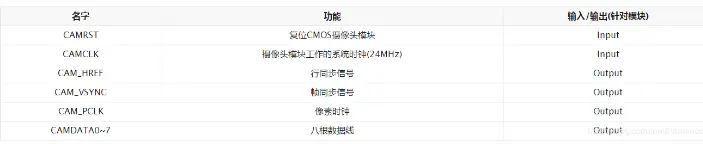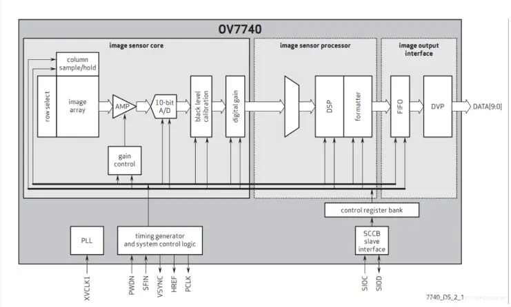 这是ov7740对外暴露出来的接口,可以看到CAMERA相关的数据外,还有两根IIC的数据线和时钟线。
