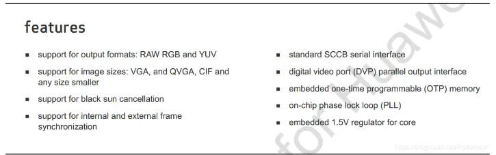 - image output interface(ISI)—pdf第六章 功能:RAW RGB/YUV(图片数据格式)、VGA/QVGA、BT601/BT656 BT601有独立的行同步信号线、帧同步信号线,而BT656是将这两种信号内嵌到数据中;