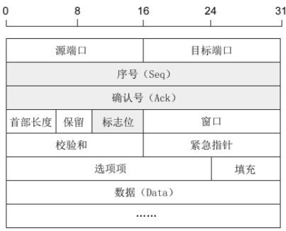 - 标志位:每个标志位占用1Bit,共有6个,分别为 URG、ACK、PSH、RST、SYN、FIN,具体含义如下: