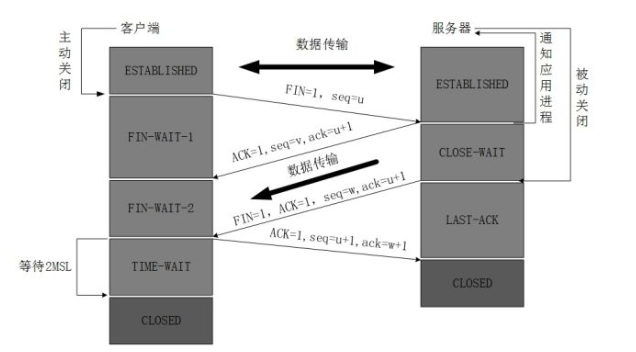 - 服务器将最后的数据发送完毕后,就向客户端发送连接释放报文,FIN=1,ack=u+1,由于在半关闭状态,服务器很可能又发送了一些数据,假定此时的序列号为seq=w,此时,服务器就进入了LAST-ACK(最后确认)状态,等待客户端的确认。