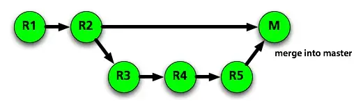 merge命令把不同的分支合并起来。如上图,在实际开放中,我们可能从master分支中切出一个分支,然后进行开发完成需求,中间经过R3,R4,R5的commit记录,最后开发完成需要合入master中,这便用到了merge。