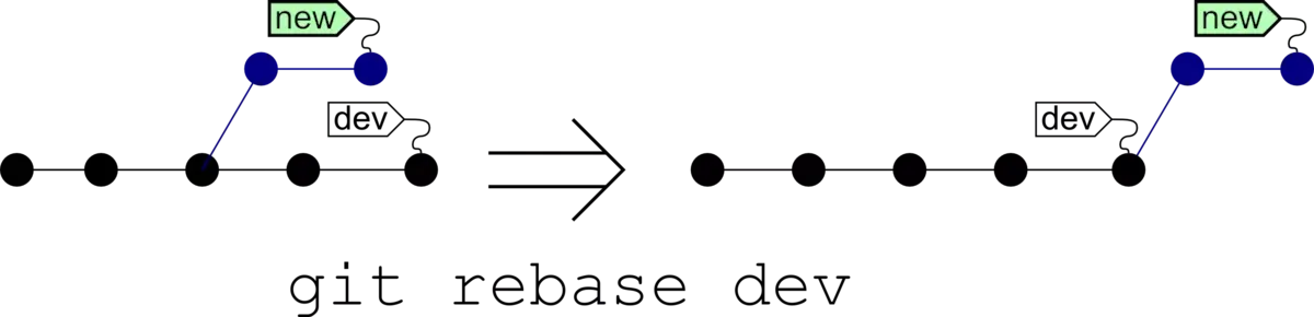 在开始阶段,我们处于new分支上,执行git rebase dev,那么new分支上新的commit都在master分支上重演一遍,最后checkout切换回到new分支。这一点与merge是一样的,合并前后所处的分支并没有改变。git rebase dev,通俗的解释就是new分支想站在dev的肩膀上继续下去。rebase也需要手动解决冲突。
