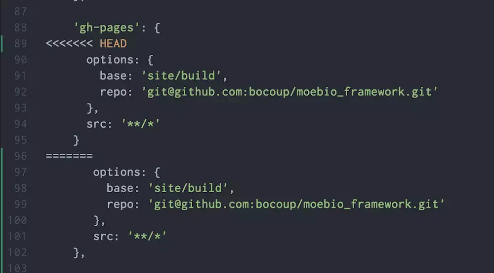 一般在merge之后,会出现conflict,需要针对冲突情况,手动解除冲突。主要是因为两个用户修改了同一文件的同一块区域。如下图所示,需要手动解除。