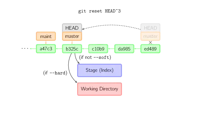 | git reset —soft <commit> | 只改变提交点,暂存区和工作目录的内容都不改变 |