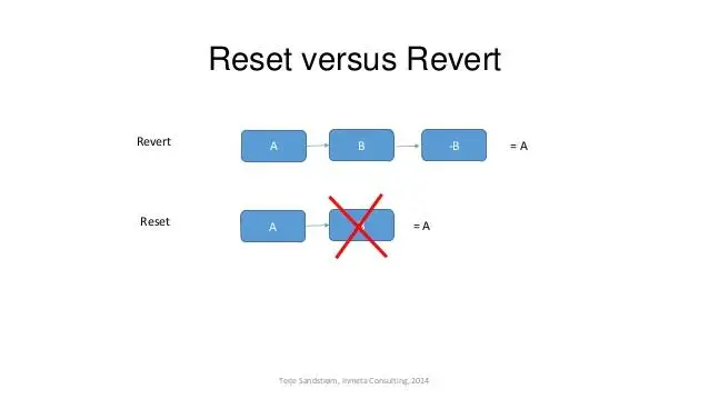 - 在回滚这一操作上看,效果差不多。但是在日后继续merge以前的老版本时有区别。因为git revert是用一次逆向的commit“中和”之前的提交,因此日后合并老的branch时,导致这部分改变不会再次出现,减少冲突。但是git reset是之间把某些commit在某个branch上删除,因而和老的branch再次merge时,这些被回滚的commit应该还会被引入,产生很多冲突。关于这一点,不太理解的可以看这篇文章。