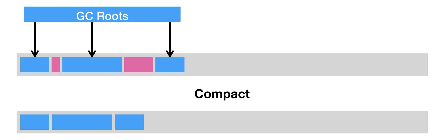 第二种是压缩(compact),即把存活的对象聚集到内存区域的起始位置,从而留下一段连续的内存空间。这种做法能够解决内存碎片化的问题,但代价是压缩算法的性能开销。