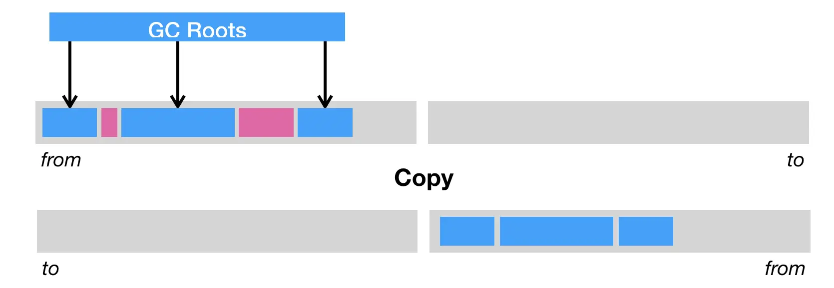第三种则是复制(copy),即把内存区域分为两等分,分别用两个指针 from 和 to 来维护,并且只是用 from 指针指向的内存区域来分配内存。当发生垃圾回收时,便把存活的对象复制到 to 指针指向的内存区域中,并且交换 from 指针和 to 指针的内容。复制这种回收方式同样能够解决内存碎片化的问题,但是它的缺点也极其明显,即堆空间的使用效率极其低下。