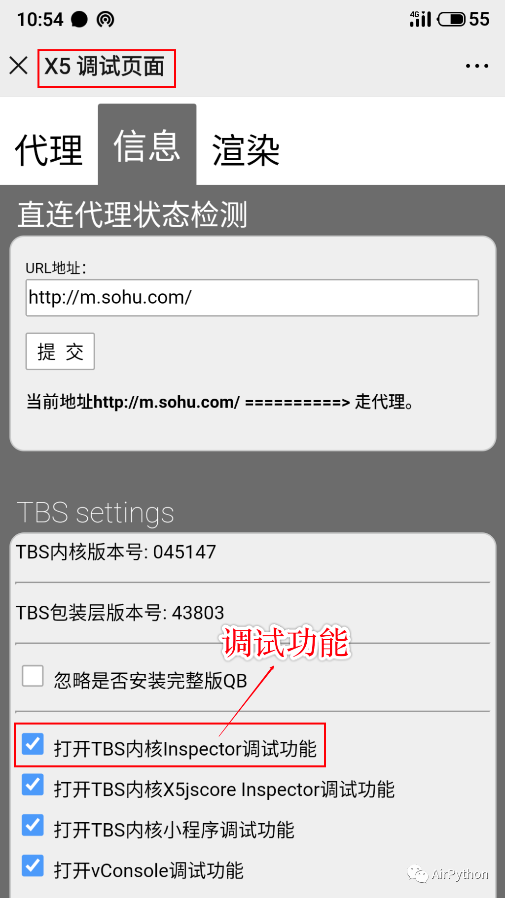 一般来说,对于低版本 6.X 的微信,只需要从任意的聊天记录,点击 debugx5.qq.com 链接,进入到 X5 调试页面,打开 TBS 内核 Inspector 调试功能即可