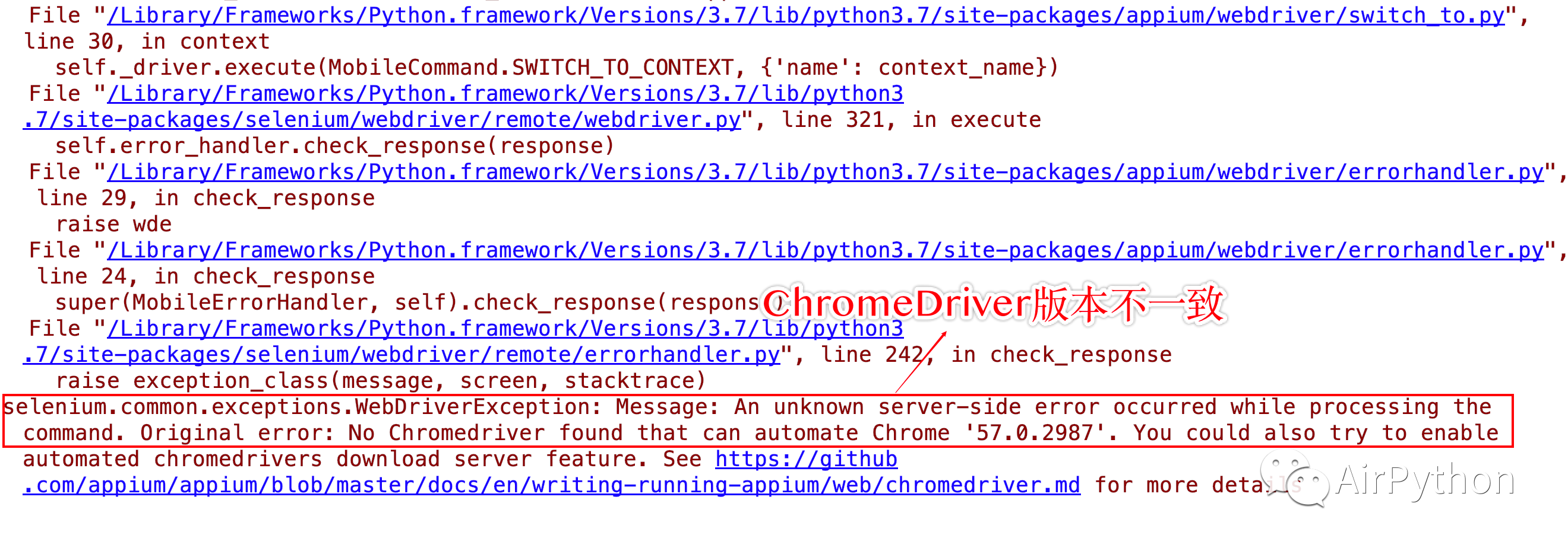 # 开启appium serverappium 如果 ChromeDriver 的版本和微信 WebView 版本不一致,会报如下的错误