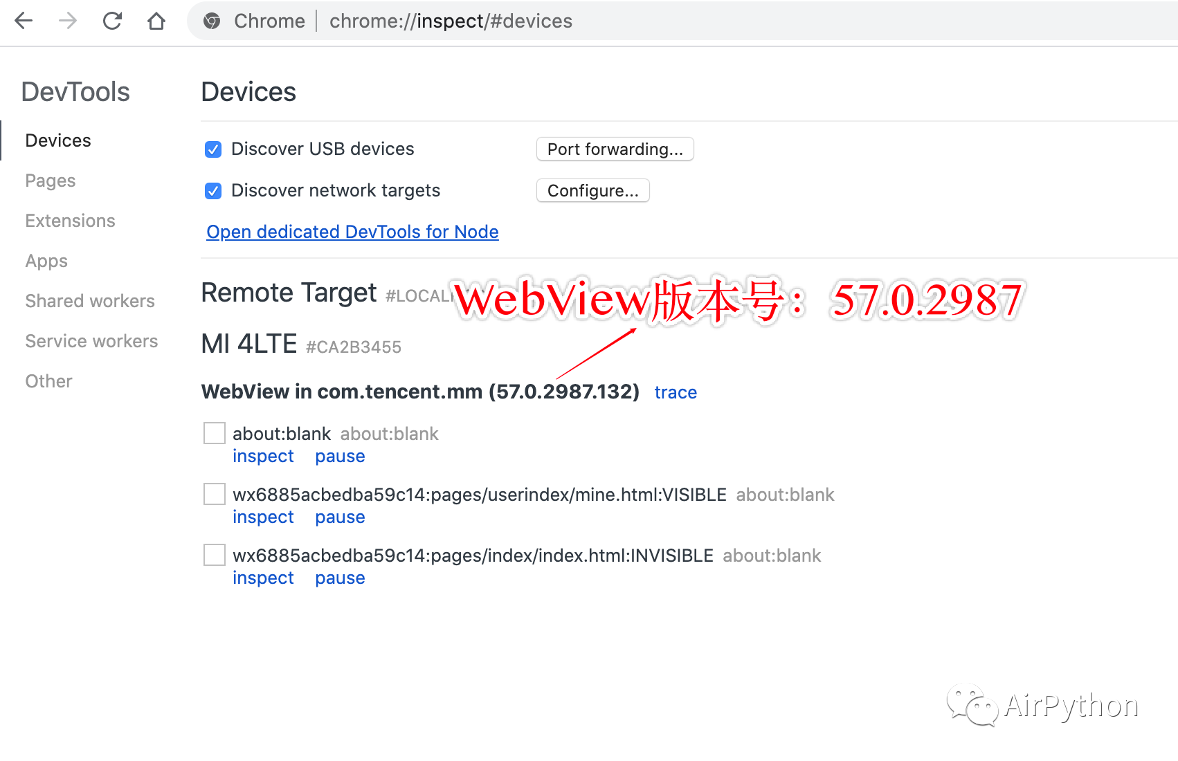 但是,在实际使用过程中发现,部分手机即使使用低版本微信,也没法通过 Chrome inspect 命名,查看到小程序页面元素
