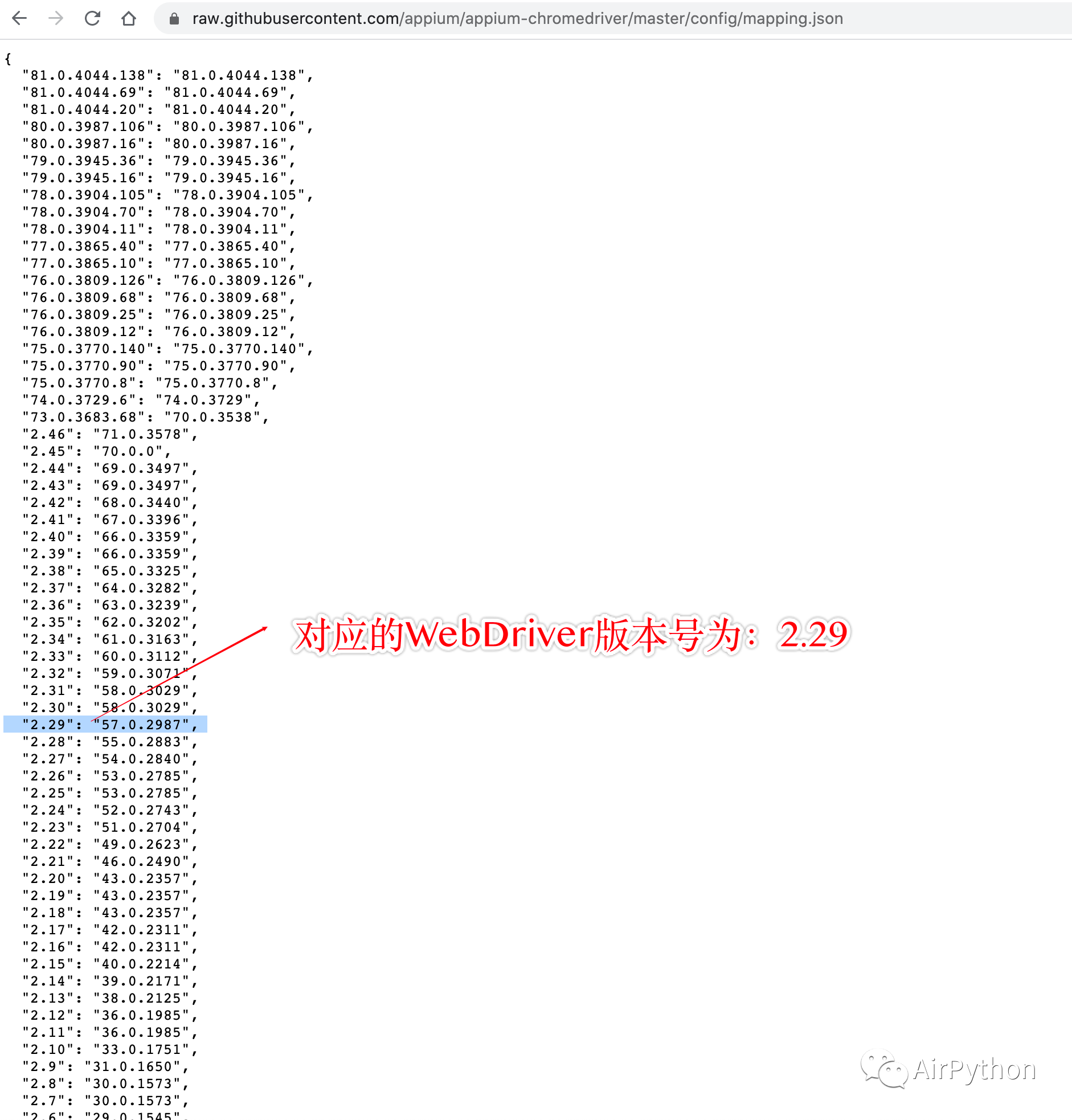 然后,通过下面的链接找到 ChromeDriver 对应的版本号