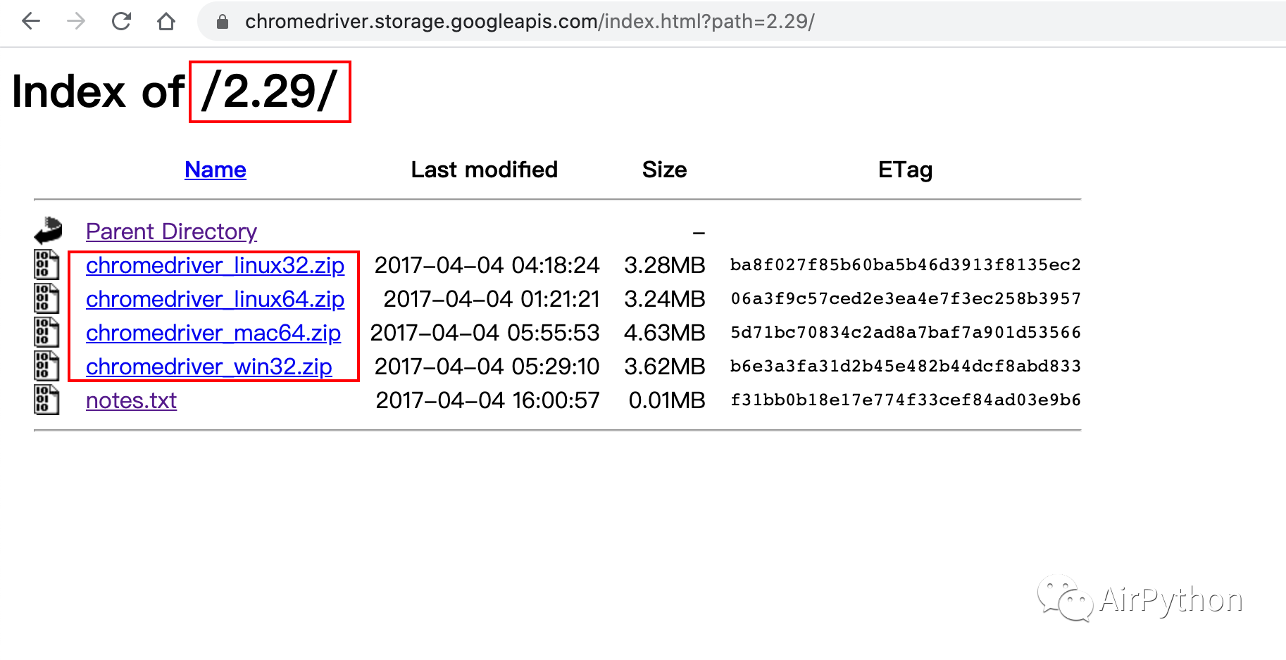 接着,下载对应版本号为:2.29 的 ChromeDriver