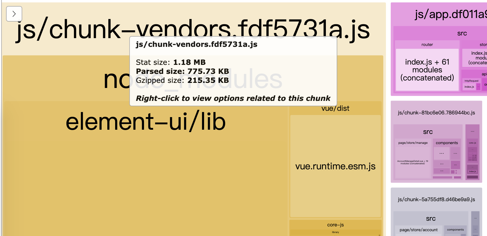 还没进行优化前vendor~app.xxxx.js 有1.18MB,咱们可以查看各个bundle大小,针对性的进行优化