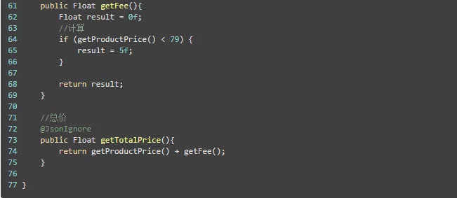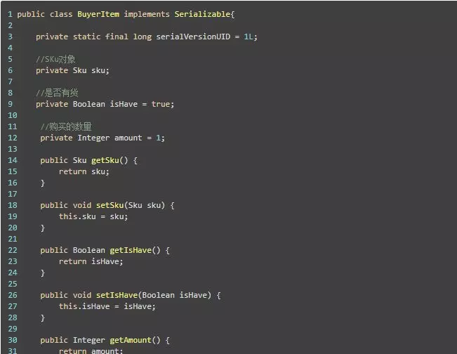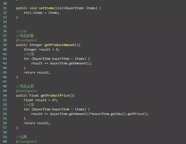 这里使用了@JsonIgonre注解是因为下面需要将BuyerCart 转换成Json格式, 而这几个字段只有get 方法, 所以不能转换, 需要使用忽略Json.