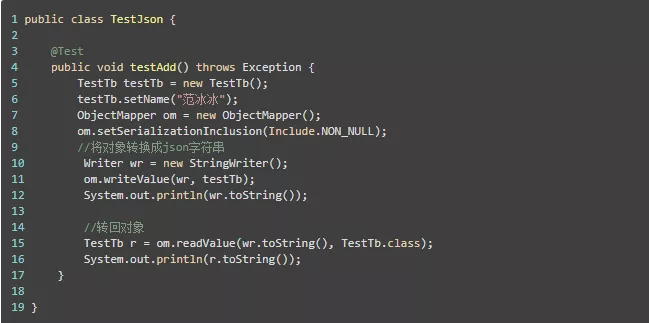 这里我们使用了Include.NON_NULL, 如果TestTb 中属性为null 的就不给转换成Json, 从对象-->Json字符串 用的是 objectMapper.writeValue(). 从Json字符串-->对象使用的是objectMapper.readValue().