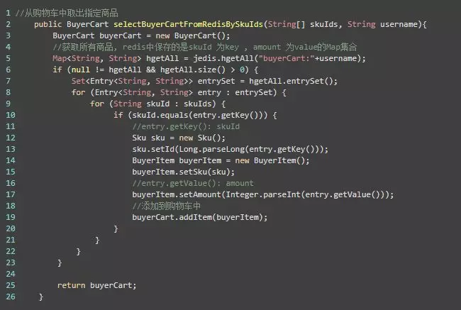 BuyerCart buyerCart = cartService.selectBuyerCartFromRedisBySkuIds(skuIds, username);