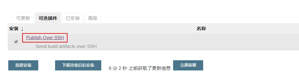 这里推荐安装这款Jenkins插件,它的主要作用是可以通过SSH在不同服务器之间传输文件和执行命令。比如说我们把Jenkins装在了测试服务器上,我们可以使用Jenkins在测试服务器上从Git仓库获取代码,然后打成Jar包。打包完成后我们可以通过这个插件将Jar包传输到正式服务器上去,然后执行正式服务器上的自动化脚本,从而实现正式服务器上的自动化部署。