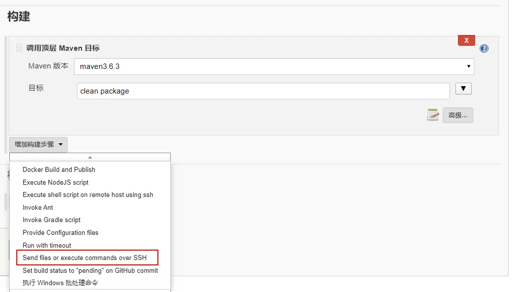 源码管理和构建中的Maven打包配置和之前的Jenkins教程中一样,只有最后一步不同,添加构建步骤为通过SSH发送文件并执行命令;