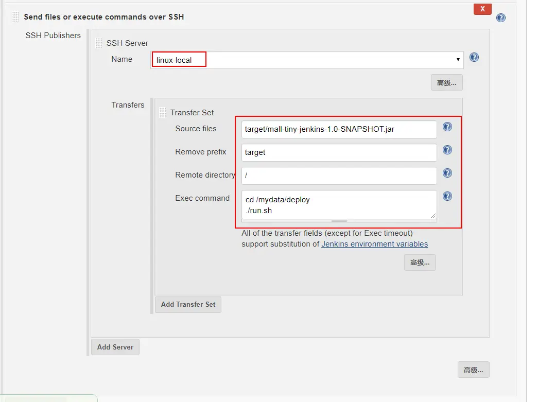 SSH Publisher,主要是源文件路径和目标文件路径,以及需要执行的脚本;