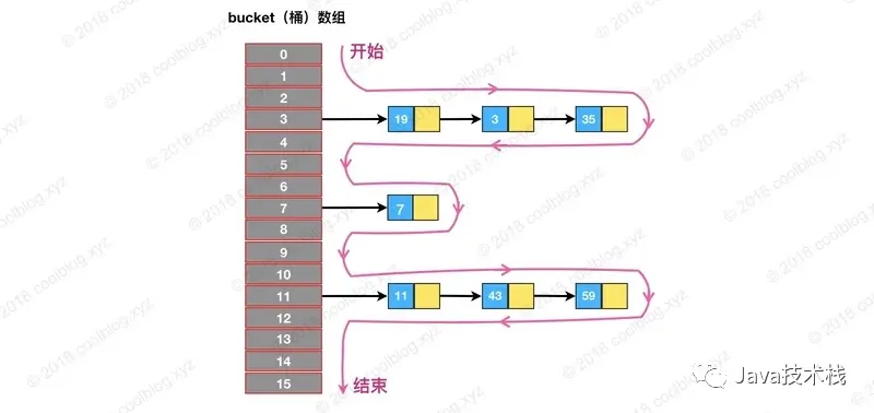 在 HashIterator 源码里面可以看出,它是先从桶数组中找到包含链表节点引用的桶。然后对这个桶指向的链表进行遍历。遍历完成后,再继续寻找下一个包含链表节点引用的桶,找到继续遍历。找不到,则结束遍历。这就解释了为什么遍历和插入的顺序不一致,不懂的同学请看下图:
