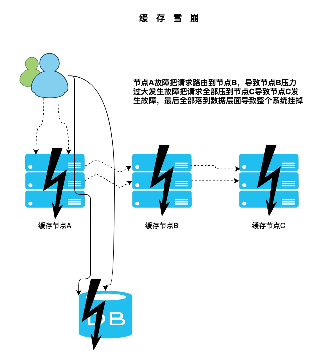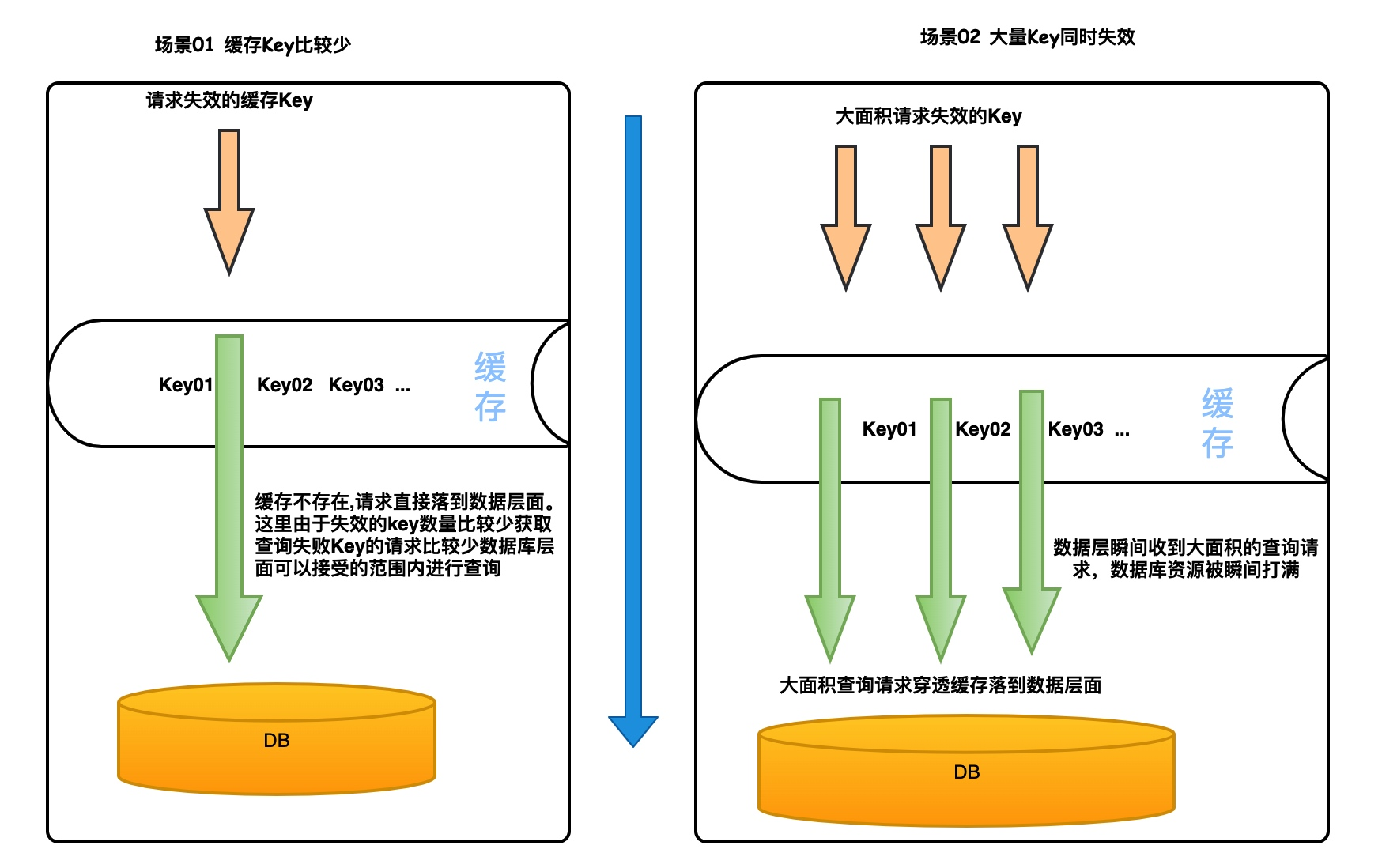- 当缓存里面的大量Key同时失效,这个时候如果有请求过来会这些失效的Key会全部落到数据库层面。导致数据库的负荷瞬间添加。可能会出现数据库宕机等特大事故。