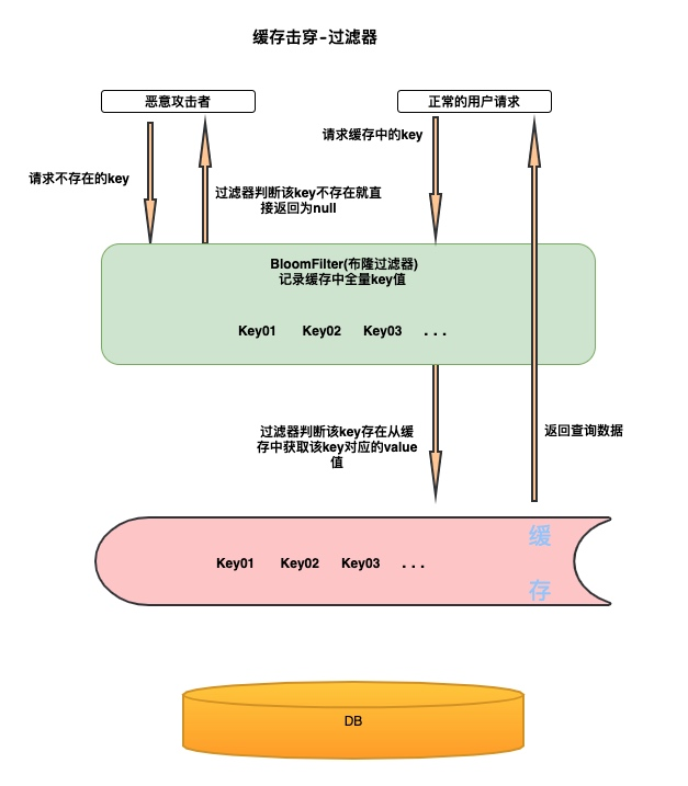 - 构建一个 BloomFilter(布隆过滤器) 缓存过滤器,记录全量数据,这样访问数据时,可以直接通过 BloomFilter 判断这个 key 是否存在,如果不存在直接返回即可,根本无需查缓存和 DB。这样在缓存之前加了一层校验。如果key值不存在,就不会请求到我们的缓存更加不会到我们的数据库中。